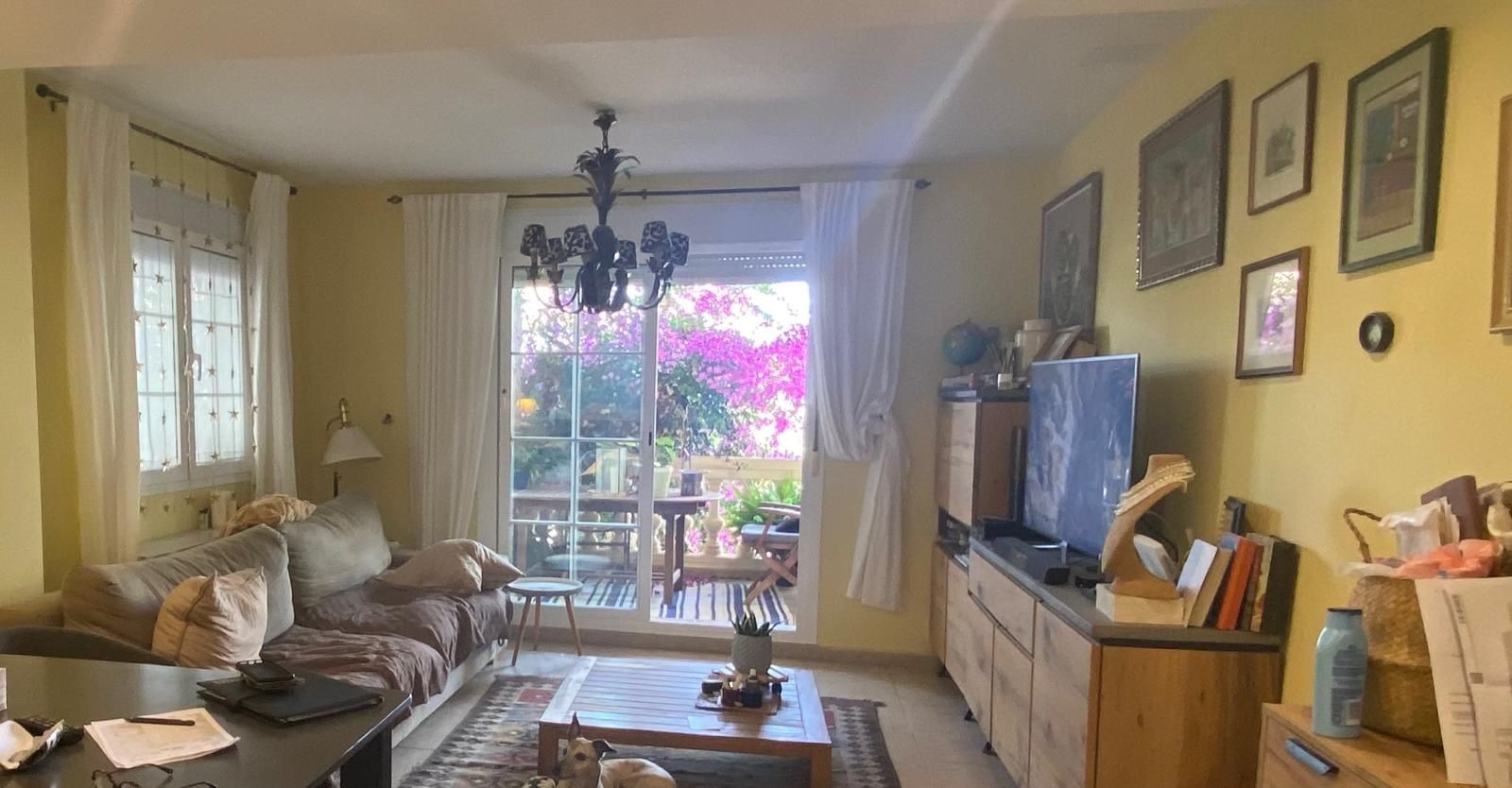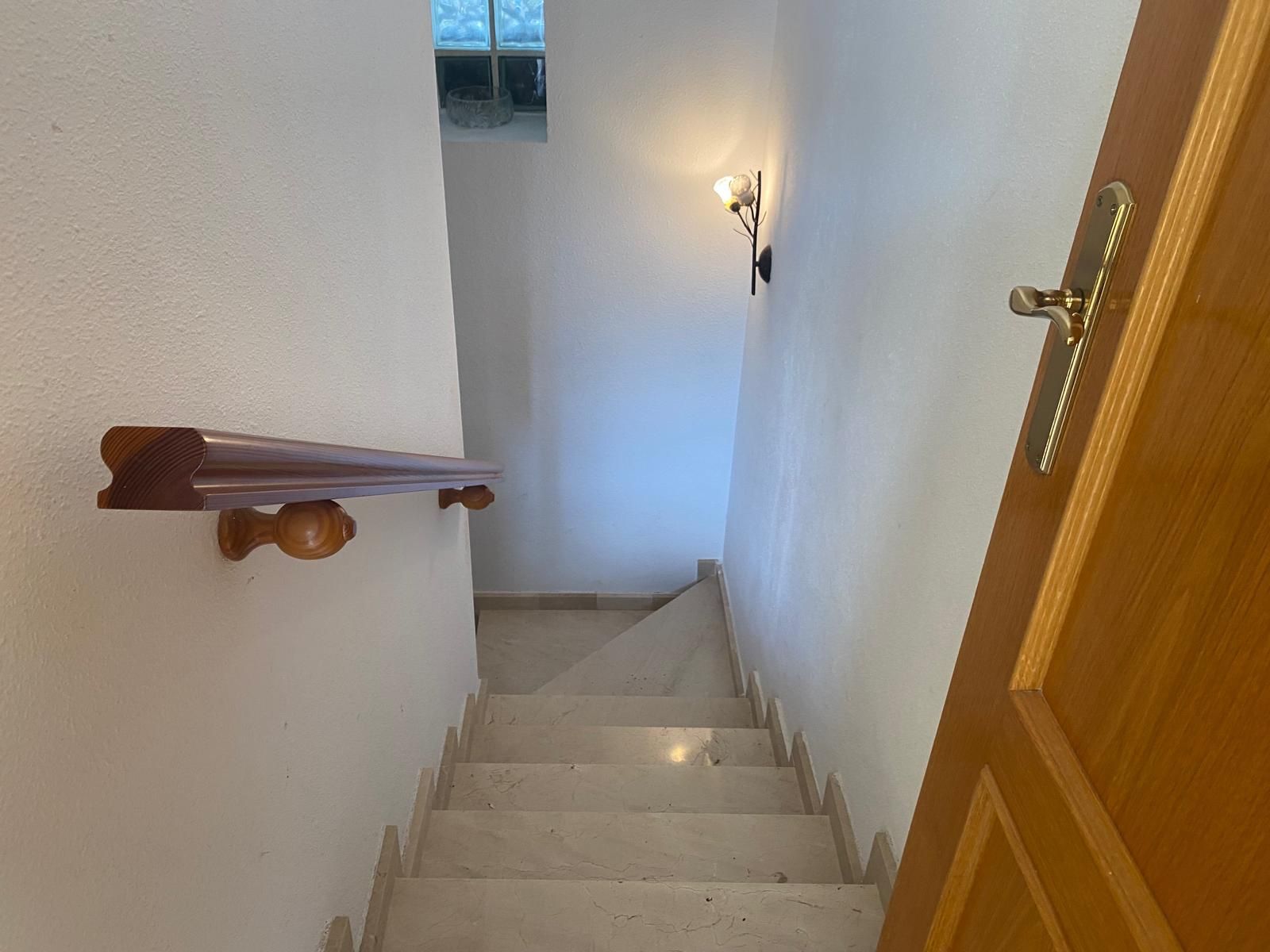 From the kitchen you walk into the spacious living/dining room and the large French doors give you access to the beautiful, spacious veranda. Stairs lead down to the back garden, which gives you access to the communal pool through the back gate.
