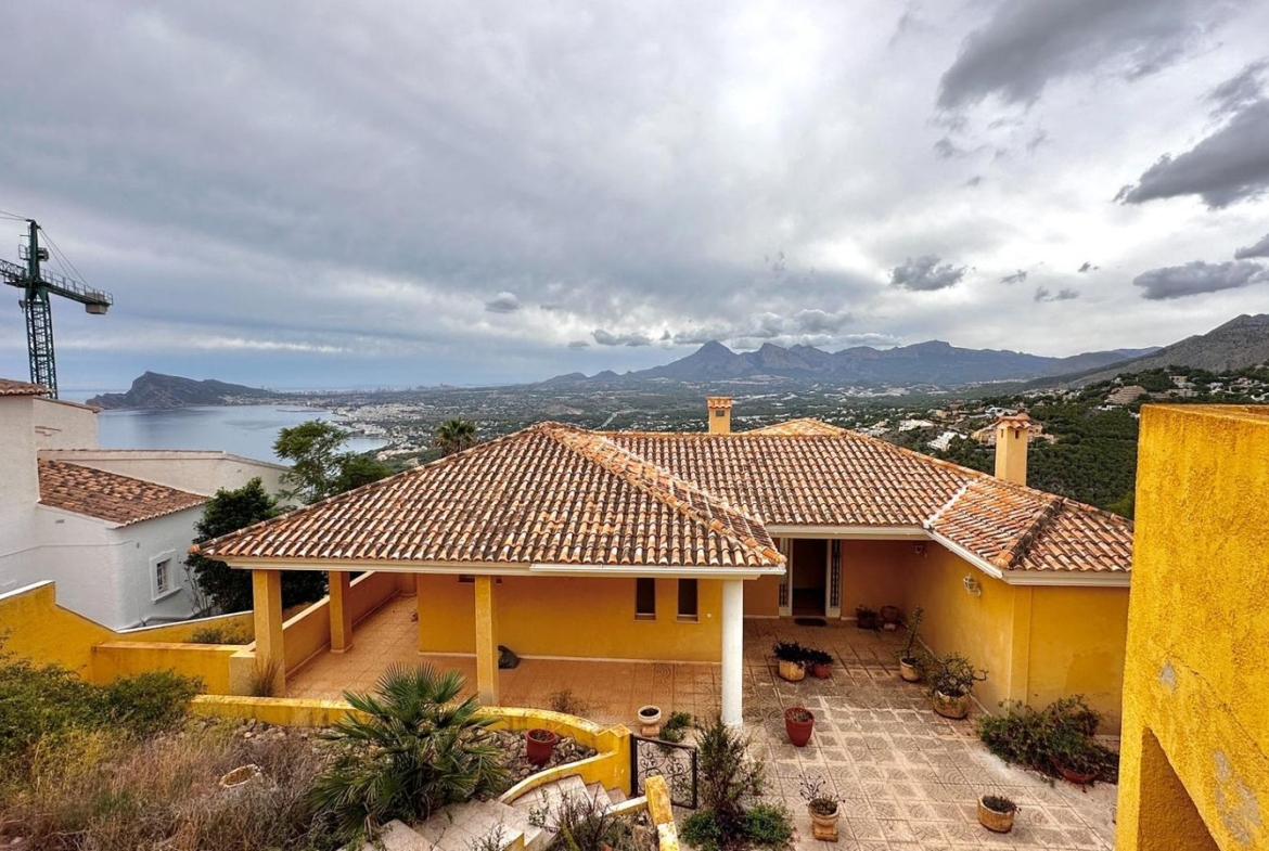 "Villa with Panoramic Views and Great Potential in Altea Hills"We present you an exclusive villa with exceptional potential located in the prestigious area of Altea Hills. Built in 2007, this impressive property has a built area of 450 square meters and sits on a 1,000 square meter plot of land, providing ample space for creativity and renewal.The villa is spread over two floors and offers five spacious bedrooms, three of which enjoy stunning sea views. Plus, you'll find five bathrooms that add comfort and privacy for the whole family. The villa has a large independent kitchen and a generous living-dining room that opens onto a terrace of one hundred square meters, the perfect place to enjoy meals outdoors and admire the panoramic views of the sea and the Altea valley.The property also includes a garage with capacity for two cars and three additional parking spaces, making it easy to receive guests. The home features amenities such as a cozy fireplace, built-in wardrobes, several walk-in closets, a gallery, a storage room, and ample garage space to meet all your storage needs.The villa has its own swimming pool, surrounded by a garden offering an idyllic setting to relax and enjoy the outdoors. Altea Hills is an exclusive community that guarantees 24-hour security and controlled access, giving you the peace of mind you deserve.This property is located just 10 minutes drive from the beautiful beaches and the charming center of Altea, known for its picturesque atmosphere and renowned restaurants. If you are looking for a renovation project in a prestigious location, this villa is the perfect choice. Don't miss the opportunity to transform this villa into the home of your dreams! Contact us today for more information or to schedule a showing.