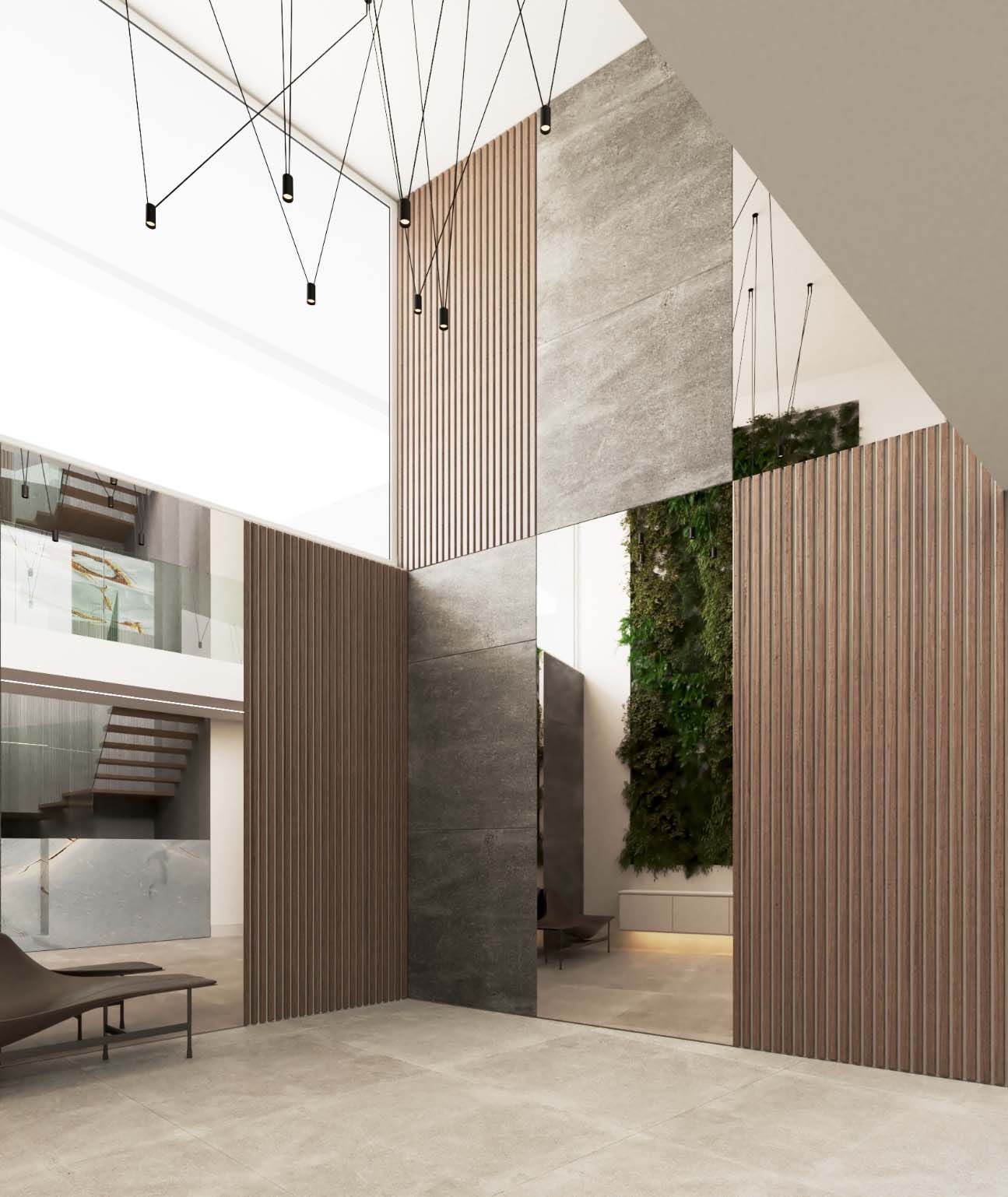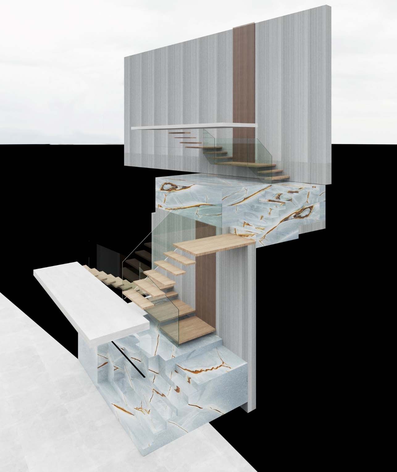 The villa features ultra-modern architecture. Every room, bathroom, living room, dining room, and kitchen offers panoramic views of the Mediterranean Sea, Altea, and Benidorm. The house spans three floors connected by a glass elevator and an impressive staircase.