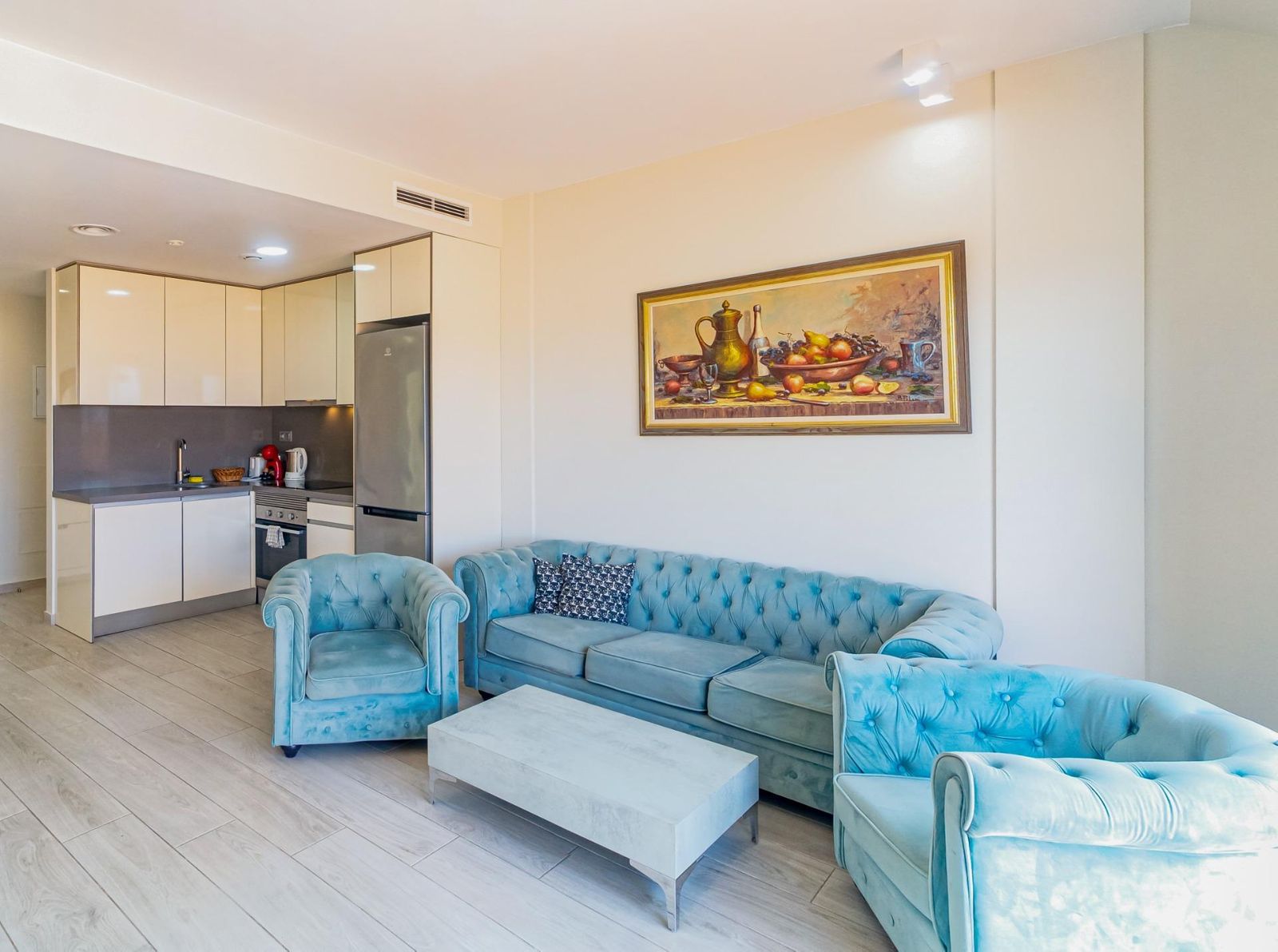 The residential complex offers many amenities: a large pool for younger children, a playground, an heated infinity pool for adults, a ping pong table, a gym room, and a sauna. The apartment is just a few minutes from supermarkets and restaurants. It has been rented out for both short and long stays.
