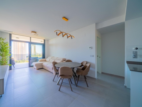 Thanks to its south-facing orientation and corner position, the apartment receives abundant natural light all day long. From the balcony, the panoramic views of the sea, skyline, and coastal atmosphere of Benidorm are truly spectacular.