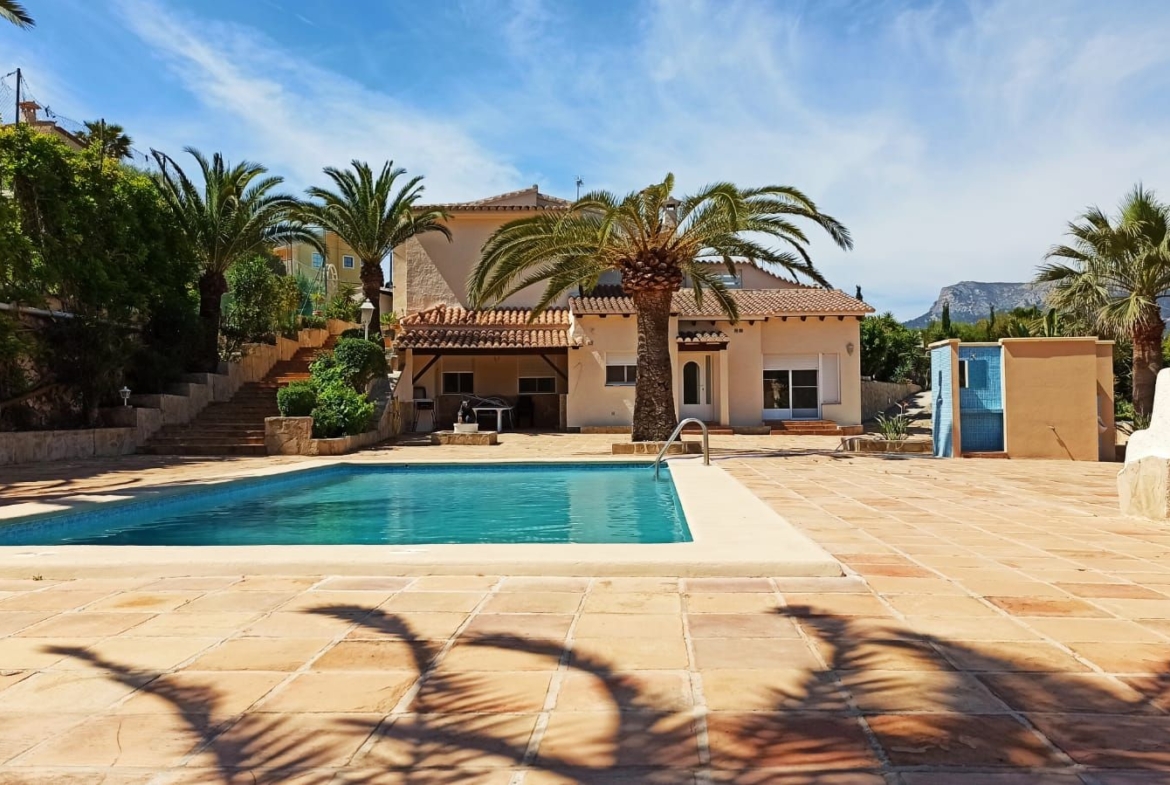 Cometa III Calpe – Villa with large plot and tennis court for sale. At Cometa III in Calpe, we present this beautiful villa on a plot of 5934 m², with tennis court, swimming pool, and a beautiful garden. The villa is divided into a main house and a guest house. Both the main and guest houses have a living room with kitchen. The main house has 3 bedrooms and 3 bathrooms. The guest house has 2 bedrooms and 2 bathrooms. In addition, the main house has a beautiful garden room and a covered terrace, with views of La Olta, Colina del Sol and Empedrola. The villa, tennis court and huge gardens are in excellent condition. The villa also has a garage for 1 car, and a carport for 2 cars. If needed, there is enough space to park a dozen vehicles in this property.