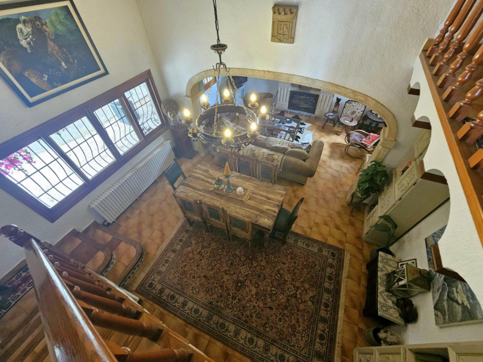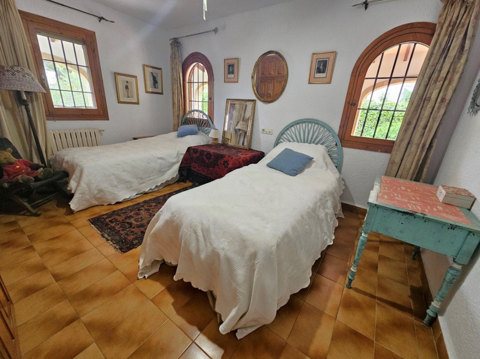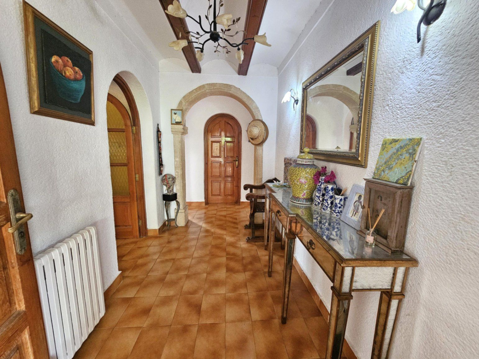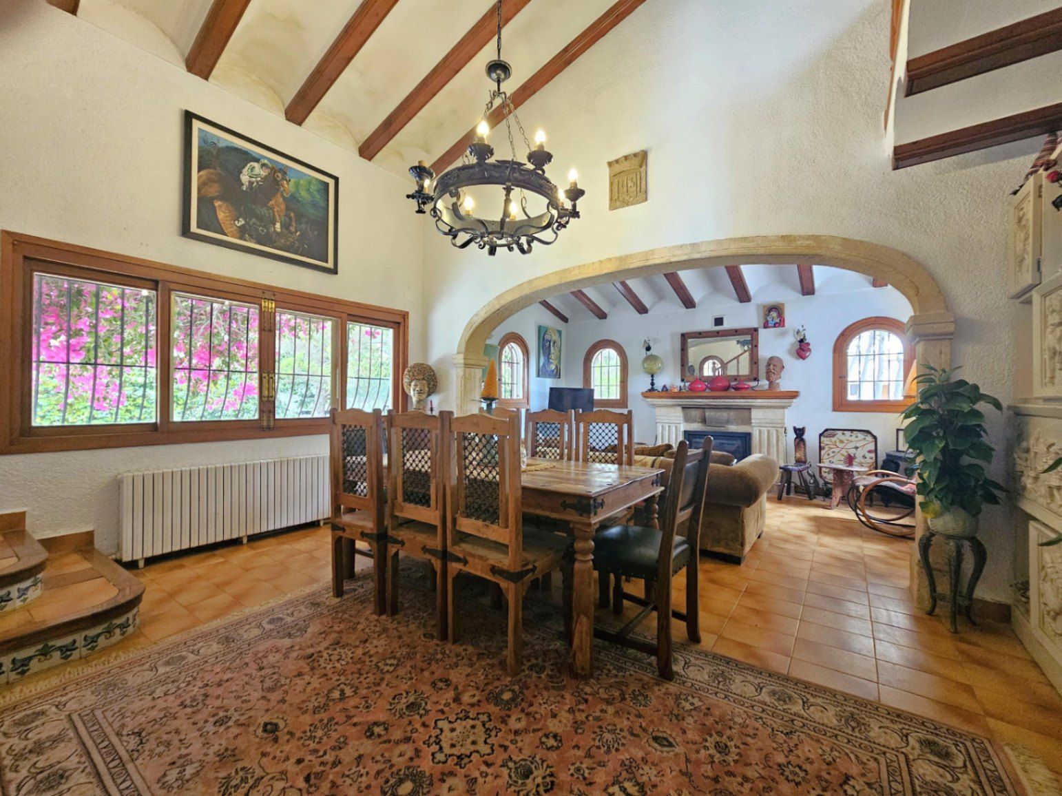 We present to you exclusively this beautiful traditional Villa in Jávea. Upon arriving at the property, we find a private parking area with sufficient space for four cars. Entering the Villa, we are welcomed by a hall that leads to a very spacious living-dining room, with the dining area featuring double-height ceilings. Passing through a beautiful Tosca stone archway, we enter the living room, which has a lovely wood-burning fireplace, also made of Tosca stone, making the space very cozy. The kitchen is a good size, with room for a table and chairs, and is equipped with many natural wood cabinets, providing plenty of storage space, along with a laundry room that makes daily life much easier. Additionally, on this floor, we have a full bathroom. On the upper floor, we find four double bedrooms, with built-in wardrobes and three bathrooms, two of which are en suite, as well as a spacious terrace from the master bedroom, with open views and a glimpse of the sea. The lower floor, accessible from an interior door, features a living-dining room with a small open kitchen, two bedrooms, a fully renovated full bathroom equipped with a shower, and another room that is currently used as storage but could be converted into a gym or another bedroom. The exterior of the Villa is a perfect place to enjoy the good weather, admire the views of Montgó, refresh ourselves in the 10×5 pool, sunbathe on the grass, or enjoy the spacious L-shaped naya with beautiful Tosca stone arches, reading a book, having dinner with family or friends, or simply sitting back and relaxing with a glass of wine. The entire Villa is equipped with diesel heating, wooden windows on the upper part, and tilt-and-turn double-glazed windows on the lower part.