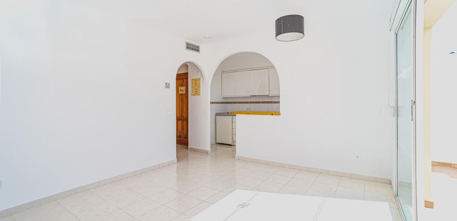 This apartment is part of a residential complex with 200 homes, located approximately 10 minutes from the center of Calpe and the sea. The apartment features a spacious bedroom, a full bathroom, a semi-open kitchen, and a living/dining room. From the living room, you can access a balcony with stunning views of the sea and the Peñón (rock), and from this terrace.