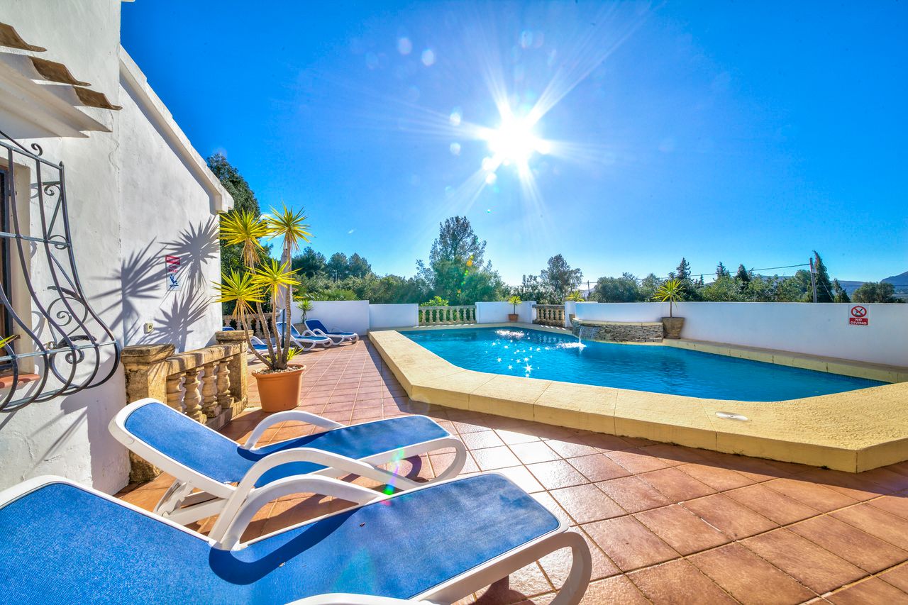 Los Arcos is a traditional Spanish styled villa with gorgeous valley views, 4 bedrooms, 2 bathrooms, summer kitchen and 2 terraces. The villa is situated 15 minutes drive from both Javea and Denia with everything they have to offer. You arrive at the villa where there is ample parking for 3 cars, up a short flight of stairs to the main terrace. Behind the pool is a summer kitchen and bar area equipped with fridge, gas BBQ, sink with a small dining table and bar stools. A great area that will certainly be the centre of the food and drink activities. Next to the summer kitchen is a shaded area with enough space for 2 sun loungers or chairs providing shade from the midday sun, reading a book or a great shaded area for the children to play. The pool is a modern design with fountain and plenty of space for the sun worshippers.Moving towards the front of the villa across the terrace is a dining table for 8 and outdoor seating with coffee table for 5 people. heading into the villa you arrive in the spacious dining / living room with the large wood burner and fire place ideal for winter comfort. The dining inside the property is for 6 people and is an attractive addition to the open plan living dining area. Next to the dining area is the large kitchen with breakfast bar for 4 people, large fridge freezer and dishwasher. Adjacent to the kitchen is an office table and work space to keep in touch with the work. You move up a flight of stairs to the "tower bedroom" which is perfectly set up with 2 single beds.. All bedrooms benefit from air-conditioning.On the other side of the living room is a short passageway to the other 3 bedrooms and the family bathroom. The bedrooms are made up of a large master bedroom with en-suite walk in shower room with hot and cold air-conditioning. The other 2 bedrooms are a twin and double with use of the shared family bathroom and both benefiting from hot and cold air-conditioning.The villa is ideally placed under the Montgo mountain and with easy access to both Javea and Denia, and just a 5 minute drive to the renowned La Sella golf course, while for tennis aficianados there is a court for hire just across the road.