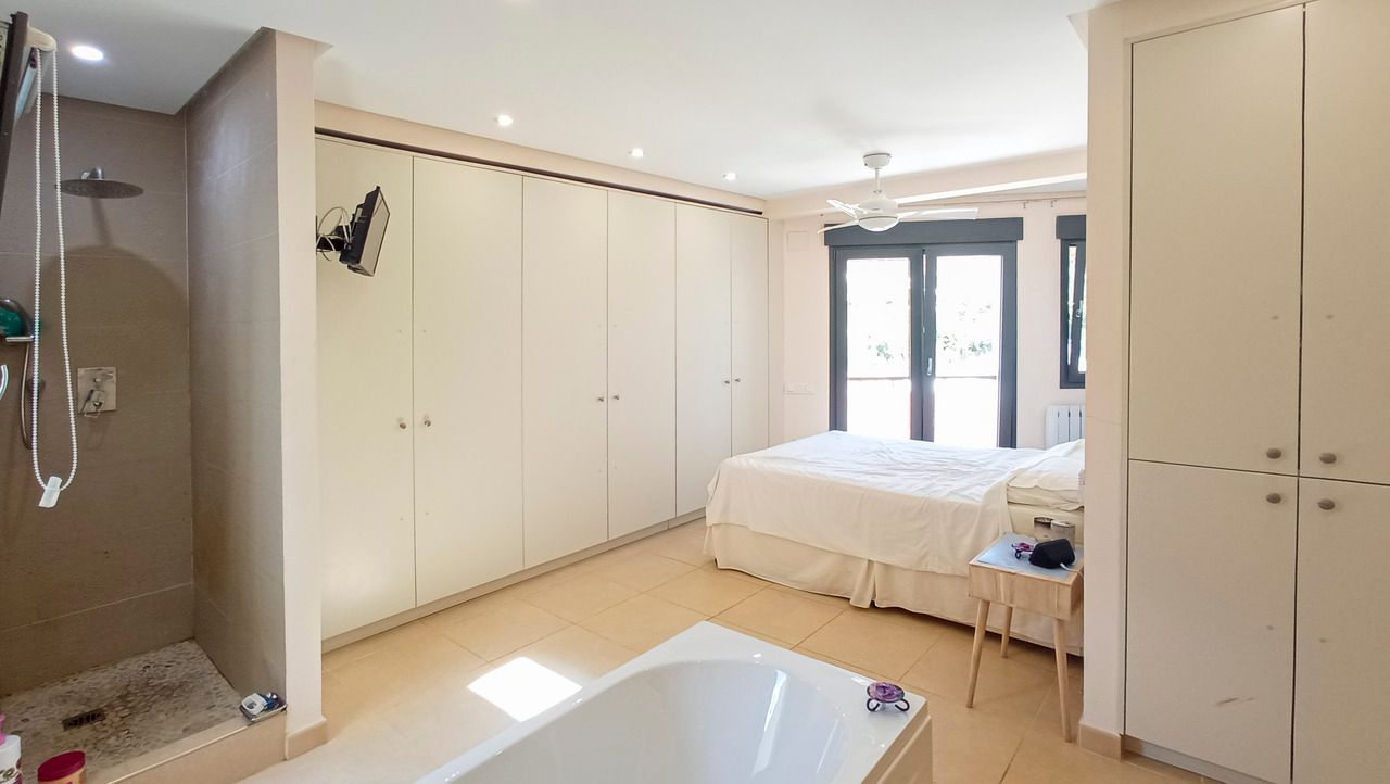 We are pleased to offer this unusual property which was built in 1980, completely renovated in 2015 and which really needs to be seen to appreciate what it can offer to those with vision. The 366m² townhouse occupies the full 4 stories of the building and offers a choice of uses. It could be one large family home or two families could have a floor each – with either option having the possibility of running a business in a dedicated space on the ground floor, or it could be bought as a investment opportunity with the aim of receiving a rental income return of an estimated 6% per annum.The ground floor comprises 2 office spaces and a huge garage which could possibly accommodate 4 cars or a combination of cars and workspace. This area can easily be separated from the rest of the building if needed. From the front door, stairs take us to the first floor which comprises a large living space with a small balcony, a kitchen, an internal patio, two bedrooms and a family shower room. The master bedroom being a large open plan area with bath, shower, sinks and toilet. Both bedrooms have built in wardrobes and central heating. Again, this section of the property can be made separate from the other parts. The main staircase continues to the second floor which again offers a large living/dining area, again with small balcony, a kitchen, two bedrooms and a family shower room. The master is the same open plan design with en-suite bath and shower areas. Again, both bedrooms have built in wardrobes and central heating. From the living area, stairs rise to the third floor where there is a large space that could be used as further living accommodation or another bedroom with a separate shower room. There is also access to the very large roof terrace that offers views to the Montgo and distant sea views.This is a unique property which is not easily categorised in the traditional manner as being a townhouse or duplex apartment. It is a very large property where the living accommodation could suit one large family who want to live together or could be two independent areas where two generations could live separately in the same house. With a small amount of work each floor could offer independent rental income sources. Please contact us to arrange a viewing to see what this property can offer you.