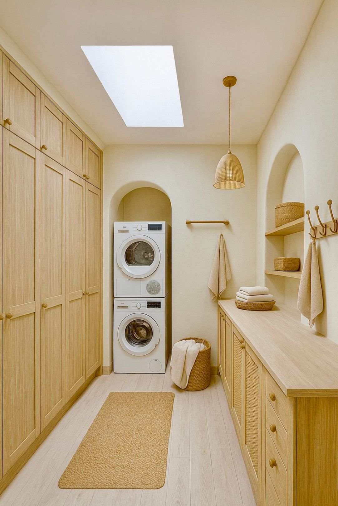 The property is designed without stairs and offers a thoughtful layout that guarantees comfort and privacy. Upon entering the villa, you arrive in an elegant entrance hall with a practical wardrobe. The spacious living area is flooded with light and forms one open space where the living room, dining room, and kitchen seamlessly flow into one another. Large windows provide direct access to the sunny terrace with wooden cover, the landscaped garden, and the swimming pool. Next to the living room, there is a space with a washing machine, dryer, and built-in wardrobe.